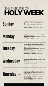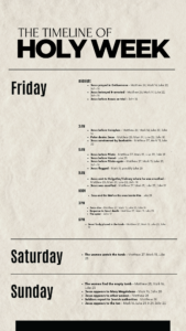 Estimated to be at midnight, Jesus prays in Gethsemane. Around 3 AM, Jesus goes on trial before Caiaphas. Peter denies Jesus even when he said he would never deny Him (Matthew 26:35). Matthew 26:72 says, “And again he denied it with an oath: “I do not know the man.” At this time, Jesus was also condemned by the Sanhedrin. Around 6 AM, Jesus goes on trial before Pilate, Herod, and then Pilate a second time. After the second time he appeared before Pilate, Jesus was flogged and beaten. Around 9 AM Friday morning, Jesus was crucified. Friday at noon, the interaction between the thief on the cross and Jesus took place. Luke 23:42-43 says, “And he said, “Jesus, remember me when you come into your kingdom.” And he said to him, “Truly, I say to you, today you will be with me in paradise.” Around 3 PM, Jesus dies and those present respond in sorrow to Jesus’ death. The Roman soldiers spear Jesus’ side to ensure He was dead. Around 6 PM, Jesus’ body was placed in the tomb with a great stone to cover its entrance.
